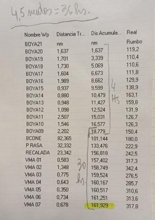 Desde la Boya 21 del canal de acceso a Ing. White hasta el par de boyas 09, tendríamos unas 4 horas de navegación. Luego unas 30 horas más hasta la entrada al Río Negro. En resumen, unas 36 horas de navegación, andando a un promedio de 4,5 nudos.