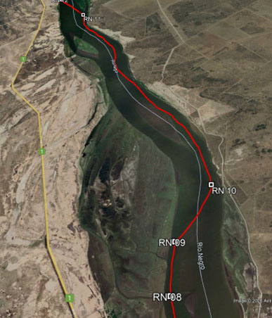 Al momento de planificar la entrada al Río Negro es muy útil contar con una imagen actualizada de Google Earth y verificar toda la información de este relato. En la imagen siguiente está trazado el track que, a sugerencia de Javier Patiño, hicimos a la entrada (línea roja).