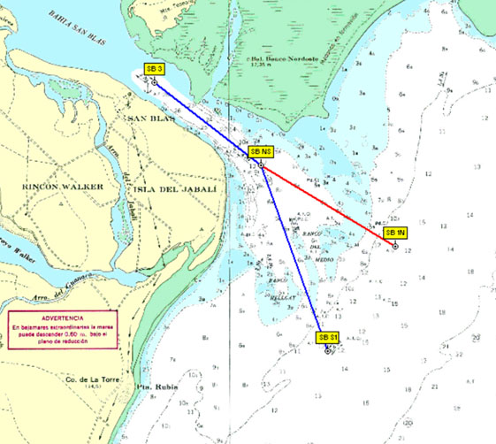 No tengo referencias de ningún baqueano. Y la carta consultada es de hace muchos años, con lo cual las profundidades pueden variar muchísimo. No obstante, y por las dudas, marqué unos WPT como para entrar en caso de necesidad. Una entrada por el Norte (SB 1N) y otra entrada por el Sur (SB 1S).