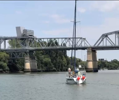 Para pasar debajo del puente debimos esperar la bajamar, que se produce aproximadamente 2 horas después que la indicada para Punta Redonda (desembocadura del Río Negro).