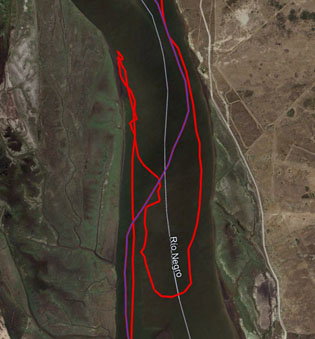 Al momento de planificar la entrada al Río Negro es muy útil contar con una imagen actualizada de Google Earth y verificar toda la información de este relato. En la imagen siguiente está trazado el track que, a sugerencia de Javier Patiño, hicimos a la entrada (línea roja).