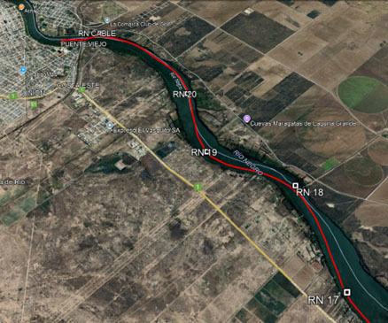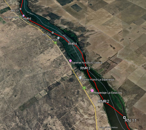 Cuando estamos llegando al puente ferrocarretero, vamos a ver una línea de alta tensión que atraviesa el río (línea amarilla). No ofrece dificultades, pero por las dudas conviene pasar pegado a la costa de Patagones, donde tenemos más altura libre (track en rojo).