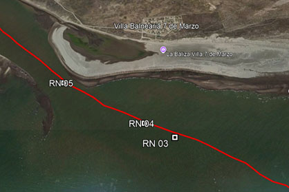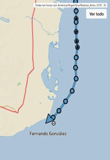 Nuestra estimación de 4,5 nudos no fue exacta, anduvimos más ligero y tardamos menos de las 36 horas prevista. Llegamos antes y estuvimos dando unas vueltas por la costa del Balneario El Cóndor. Cuando faltaban 2 horas para la pleamar, pusimos el rumbo que nos había sugerido Javier.