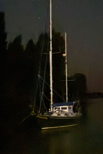 Hasta acá llegamos aprovechando lo que quedaba de marea, y siendo las 21.00 hs fondeamos para dormir tranquilos entre la isla y la costa de Viedma (40° 52,724’ y 62°54,395’). En realidad, se puede fondear en cualquier lado. Nosotros seguíamos avanzando todo lo que podíamos para llegar al día siguiente con la bajamar al paso bajo el puente.