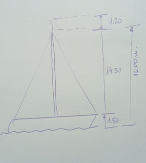 La altura del mástil es de 14,50 sobre cubierta. Lo que hace un total de 16 metros sobre el nivel del agua. A eso le debemos sumar la antena de VHF, veleta, luces, etc. lo que hace un total de 17,20 metros sobre el agua.